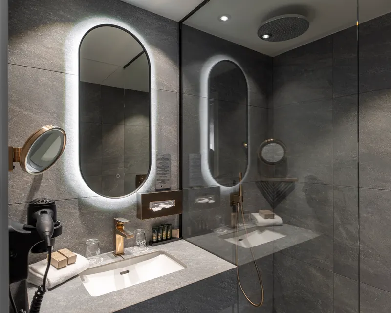 Chaque chambre Deluxe dispose d’un évier simple pour votre commodité et d’une douche à l’italienne moderne, parfaite pour un moment de détente après une journée bien remplie. Vous profiterez d’un espace bureau spacieux avec une grande table, idéal pour travailler confortablement depuis votre chambre.